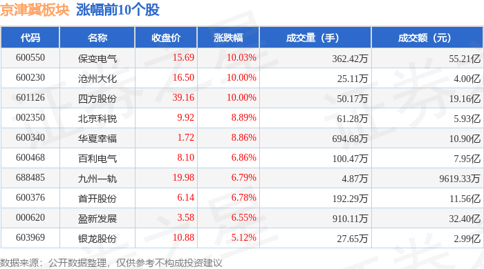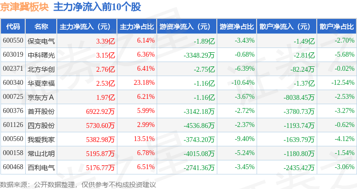 从资金流向上来看,当日京津冀板块主力资金净流出13.13亿元,游资资金净流出4.36亿元,散户资金净流入17.49亿元。京津冀板块个股资金流向见下表: