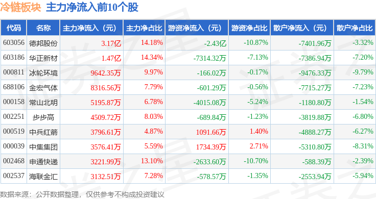 从资金流向上来看,当日冷链板块主力资金净流出9.19亿元,游资资金净流出2276.79万元,散户资金净流入9.42亿元。冷链板块个股资金流向见下表: