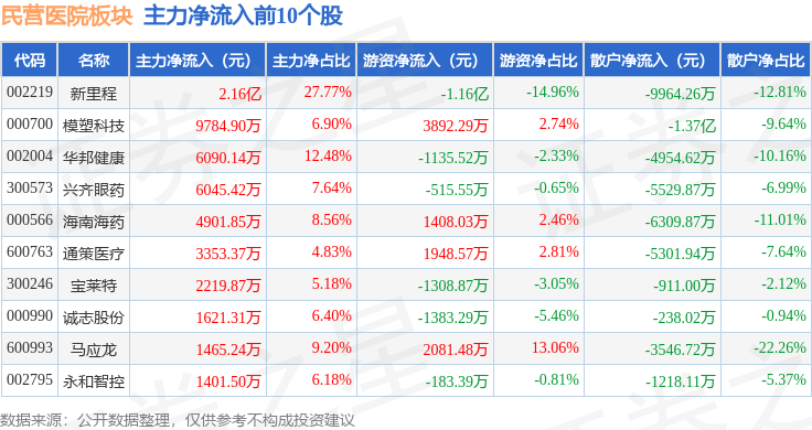 从资金流向上来看,当日民营医院板块主力资金净流出4.56亿元,游资资金净流入9617.29万元,散户资金净流入3.6亿元。民营医院板块个股资金流向见下表: