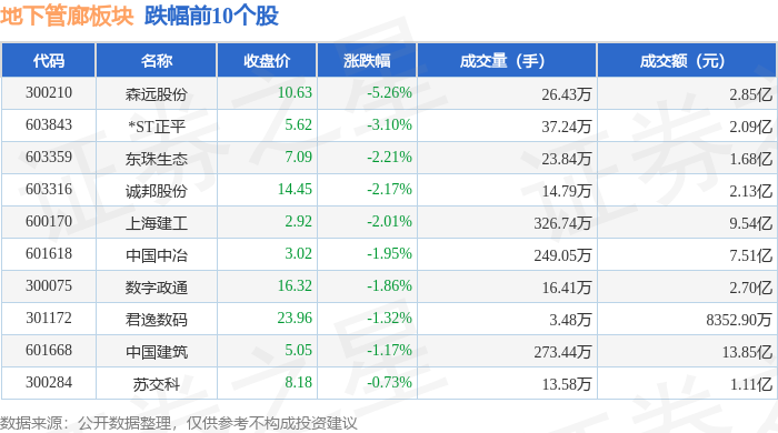 证券之星消息,1月19日地下管廊板块较上一交易日下跌0.09%,森远股份领跌。当日上证指数报收于4114.0,上涨0.29%。深证成指报收于14294.05,上涨0.09%。地下管廊板块个股涨跌见下表: