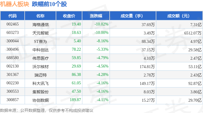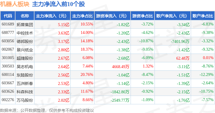 从资金流向上来看,当日机器人板块主力资金净流出46.48亿元,游资资金净流入4.21亿元,散户资金净流入42.27亿元。机器人板块个股资金流向见下表: