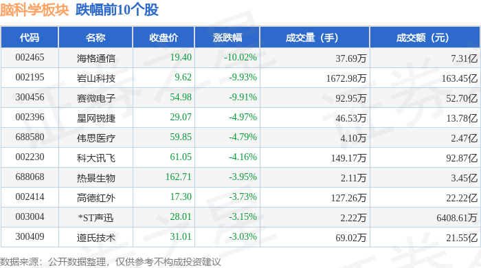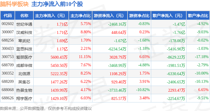 从资金流向上来看,当日脑科学板块主力资金净流出36.72亿元,游资资金净流入8.07亿元,散户资金净流入28.64亿元。脑科学板块个股资金流向见下表: