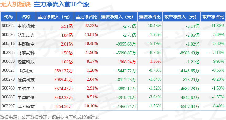 从资金流向上来看,当日无人机板块主力资金净流出16.35亿元,游资资金净流入2.25亿元,散户资金净流入14.1亿元。无人机板块个股资金流向见下表: