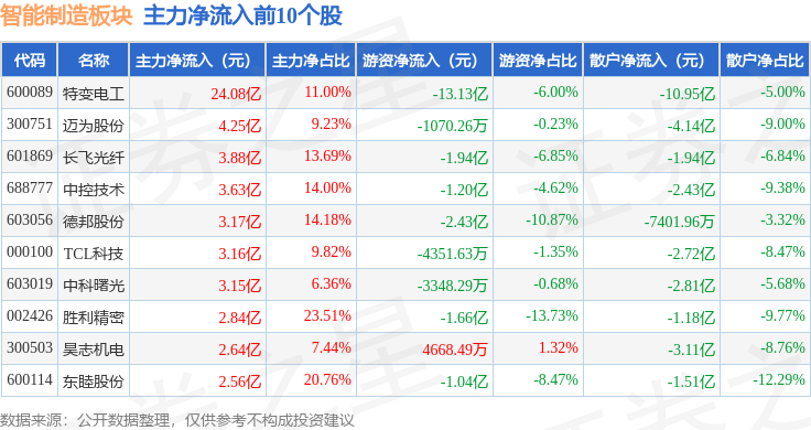从资金流向上来看,当日智能制造板块主力资金净流出15.91亿元,游资资金净流出12.9亿元,散户资金净流入28.81亿元。智能制造板块个股资金流向见下表: