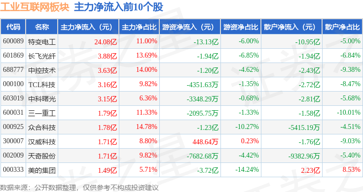 从资金流向上来看,当日工业互联网板块主力资金净流出17.38亿元,游资资金净流出13.27亿元,散户资金净流入30.65亿元。工业互联网板块个股资金流向见下表: