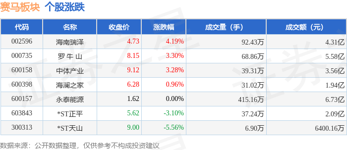 证券之星消息,1月19日赛马板块较上一交易日上涨0.91%,海南瑞泽领涨。当日上证指数报收于4114.0,上涨0.29%。深证成指报收于14294.05,上涨0.09%。赛马板块个股涨跌见下表: