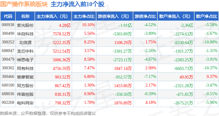 从资金流向上来看,当日国产操作系统板块主力资金净流出28.56亿元,游资资金净流入6.64亿元,散户资金净流入21.93亿元。国产操作系统板块个股资金流向见下表: