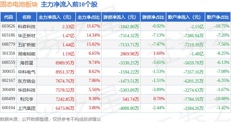 从资金流向上来看,当日固态电池板块主力资金净流出30.28亿元,游资资金净流入7.85亿元,散户资金净流入22.43亿元。固态电池板块个股资金流向见下表: