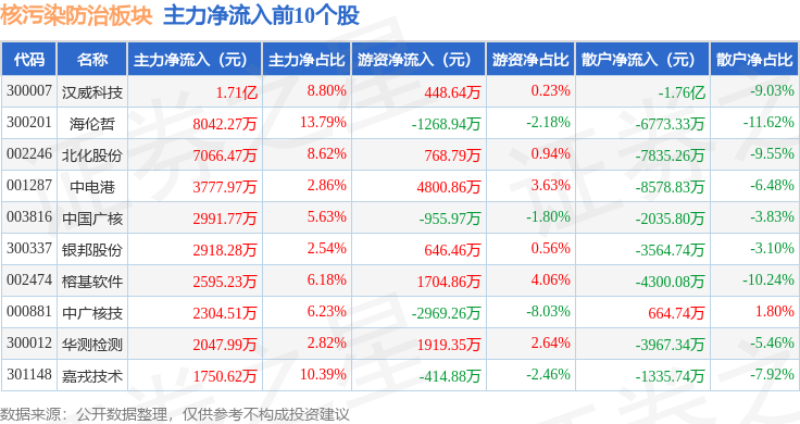 从资金流向上来看,当日核污染防治板块主力资金净流入2.11亿元,游资资金净流出4077.93万元,散户资金净流出1.7亿元。核污染防治板块个股资金流向见下表: