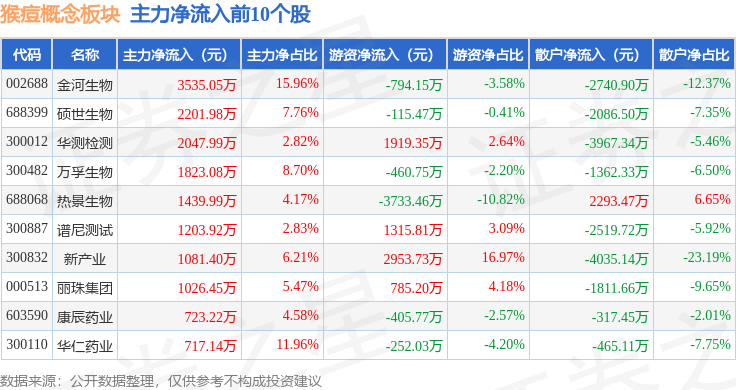 从资金流向上来看,当日猴痘概念板块主力资金净流出4.71亿元,游资资金净流入7792.48万元,散户资金净流入3.93亿元。猴痘概念板块个股资金流向见下表: