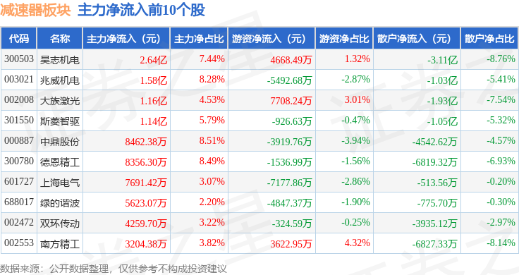从资金流向上来看,当日减速器板块主力资金净流出8.22亿元,游资资金净流入3.97亿元,散户资金净流入4.25亿元。减速器板块个股资金流向见下表: