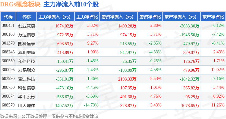 从资金流向上来看,当日DRGs概念板块主力资金净流出7.74亿元,游资资金净流入1.68亿元,散户资金净流入6.06亿元。DRGs概念板块个股资金流向见下表: