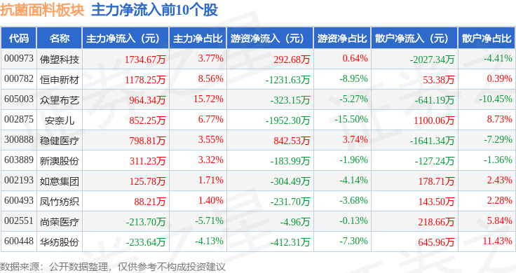 从资金流向上来看,当日抗菌面料板块主力资金净流出1.11亿元,游资资金净流入539.08万元,散户资金净流入1.06亿元。抗菌面料板块个股资金流向见下表: