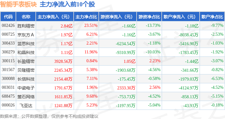 从资金流向上来看,当日智能手表板块主力资金净流出4.66亿元,游资资金净流入5869.88万元,散户资金净流入4.07亿元。智能手表板块个股资金流向见下表: