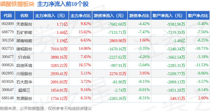 从资金流向上来看,当日磷酸铁锂板块主力资金净流出27.12亿元,游资资金净流入3.68亿元,散户资金净流入23.44亿元。磷酸铁锂板块个股资金流向见下表: