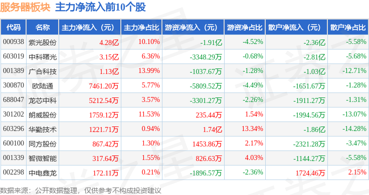 从资金流向上来看,当日服务器板块主力资金净流出39.68亿元,游资资金净流入7.52亿元,散户资金净流入32.17亿元。服务器板块个股资金流向见下表: