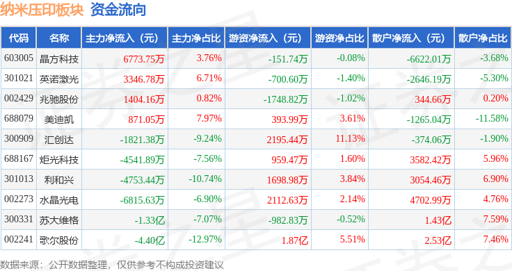 从资金流向上来看,当日纳米压印板块主力资金净流出6.29亿元,游资资金净流入2.25亿元,散户资金净流入4.04亿元。纳米压印板块个股资金流向见下表:
