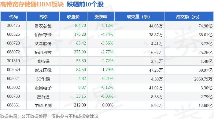 证券之星消息,1月19日高带宽存储器HBM板块较上一交易日下跌0.45%,香农芯创领跌。当日上证指数报收于4114.0,上涨0.29%。深证成指报收于14294.05,上涨0.09%。高带宽存储器HBM板块个股涨跌见下表: