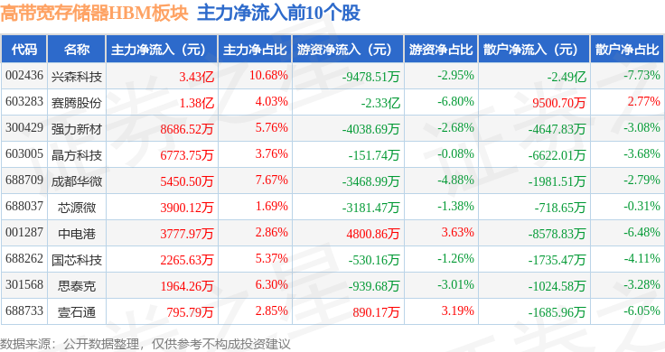 从资金流向上来看,当日高带宽存储器HBM板块主力资金净流出29.36亿元,游资资金净流入8.79亿元,散户资金净流入20.57亿元。高带宽存储器HBM板块个股资金流向见下表: