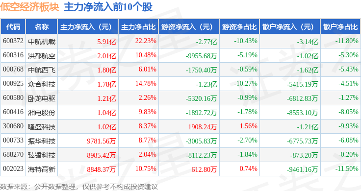 从资金流向上来看,当日低空经济板块主力资金净流出21.55亿元,游资资金净流入1.91亿元,散户资金净流入19.64亿元。低空经济板块个股资金流向见下表: