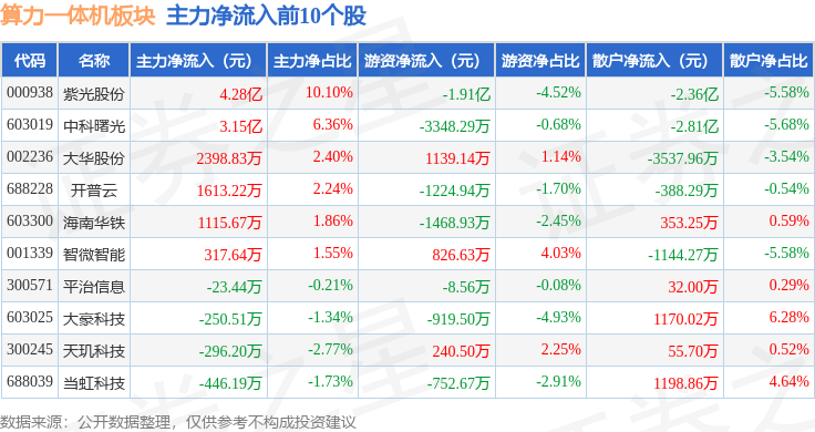 从资金流向上来看,当日算力一体机板块主力资金净流出29.13亿元,游资资金净流入6.62亿元,散户资金净流入22.51亿元。算力一体机板块个股资金流向见下表: