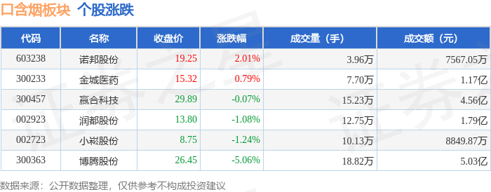 证券之星消息,1月19日口含烟板块较上一交易日下跌1.4%,博腾股份领跌。当日上证指数报收于4114.0,上涨0.29%。深证成指报收于14294.05,上涨0.09%。口含烟板块个股涨跌见下表: