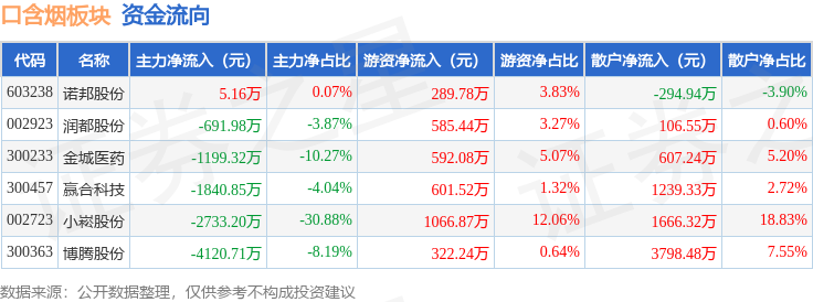 从资金流向上来看,当日口含烟板块主力资金净流出1.06亿元,游资资金净流入3457.93万元,散户资金净流入7122.97万元。口含烟板块个股资金流向见下表: