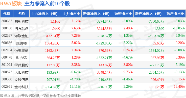 从资金流向上来看,当日RWA板块主力资金净流入1119.13万元,游资资金净流入8994.73万元,散户资金净流出1.01亿元。RWA板块个股资金流向见下表: