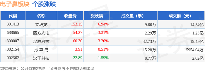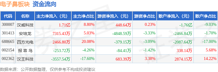 从资金流向上来看,当日电子鼻板块主力资金净流入2.31亿元,游资资金净流出4180.12万元,散户资金净流出1.89亿元。电子鼻板块个股资金流向见下表: