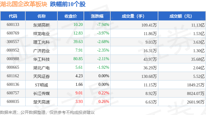 证券之星消息,1月19日湖北国企改革板块较上一交易日下跌0.29%,东湖高新领跌。当日上证指数报收于4114.0,上涨0.29%。深证成指报收于14294.05,上涨0.09%。湖北国企改革板块个股涨跌见下表: