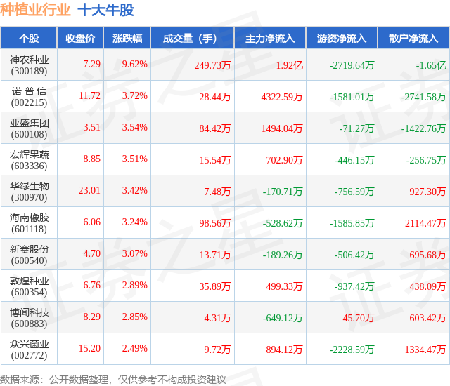 个股表现方面,种植业行业当日领涨股为神农种业(300189),该股当日报收7.29,上涨9.62%,成交量249.73万,主力资金净流入1.92亿元。诺 普 信(002215)以上涨3.72%紧随其后,该股当日成交量28.44万,主力资金净流入4322.59万元。除此之外,亚盛集团(600108)、宏辉果蔬(603336)、华绿生物(300970)均进入当日牛股之列。具体个股列表见下表: