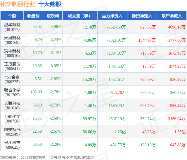 个股表现方面,化学制品行业当日领跌股为星华新材(301077),该股当日报收33.37,下跌4.96%,成交量12.18万,主力资金净流出5525.69万元。天晟新材(300169)以下跌4.23%紧随其后,该股当日成交量44.86万,主力资金净流出3321.97万元。除此之外,瑞丰新材(300910)、正丹股份(300641)、*ST金泰(300225)均进入当日熊股之列。具体个股列表见下表:
