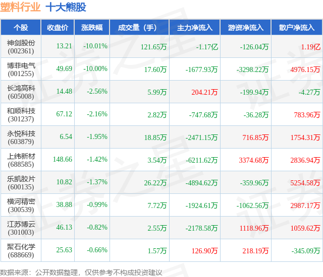个股表现方面,塑料行业当日领跌股为神剑股份(002361),该股当日报收13.21,下跌10.01%,成交量121.65万,主力资金净流出1.17亿元。博菲电气(001255)以下跌10.0%紧随其后,该股当日成交量17.6万,主力资金净流出1677.93万元。除此之外,长鸿高科(605008)、和顺科技(301237)、永悦科技(603879)均进入当日熊股之列。具体个股列表见下表: