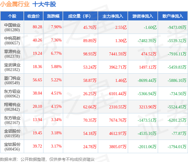 个股表现方面,小金属行业当日领涨股为中国铀业(001280),该股当日报收80.28,上涨7.9%,成交量45.7万,主力资金净流入2.55亿元。中钨高新(000657)以上涨7.36%紧随其后,该股当日成交量89.89万,主力资金净流入1.3亿元。除此之外,章源钨业(002378)、宝武镁业(002182)、厦门钨业(600549)均进入当日牛股之列。具体个股列表见下表: