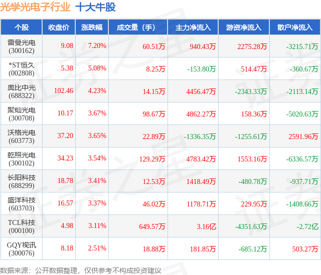 个股表现方面,光学光电子行业当日领涨股为雷曼光电(300162),该股当日报收9.08,上涨7.2%,成交量60.51万,主力资金净流入940.43万元。*ST恒久(002808)以上涨5.08%紧随其后,该股当日成交量8.25万,主力资金净流出153.8万元。除此之外,奥比中光(688322)、聚灿光电(300708)、沃格光电(603773)均进入当日牛股之列。具体个股列表见下表: