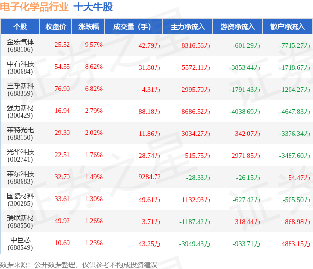 个股表现方面,电子化学品行业当日领涨股为金宏气体(688106),该股当日报收25.52,上涨9.57%,成交量42.79万,主力资金净流入8316.56万元。中石科技(300684)以上涨8.62%紧随其后,该股当日成交量31.8万,主力资金净流入5572.11万元。除此之外,三孚新科(688359)、强力新材(300429)、莱特光电(688150)均进入当日牛股之列。具体个股列表见下表: