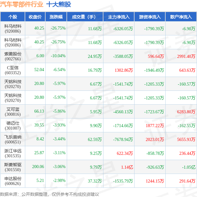 个股表现方面,汽车零部件行业当日领跌股为科马材料(920086),该股当日报收40.25,下跌26.75%,成交量11.68万,主力资金净流出6326.05万元。科马材料(920086)以下跌26.75%紧随其后,该股当日成交量11.68万,主力资金净流出6326.05万元。除此之外,索菱股份(002766)、C至信(603352)、天铭科技(920270)均进入当日熊股之列。具体个股列表见下表: