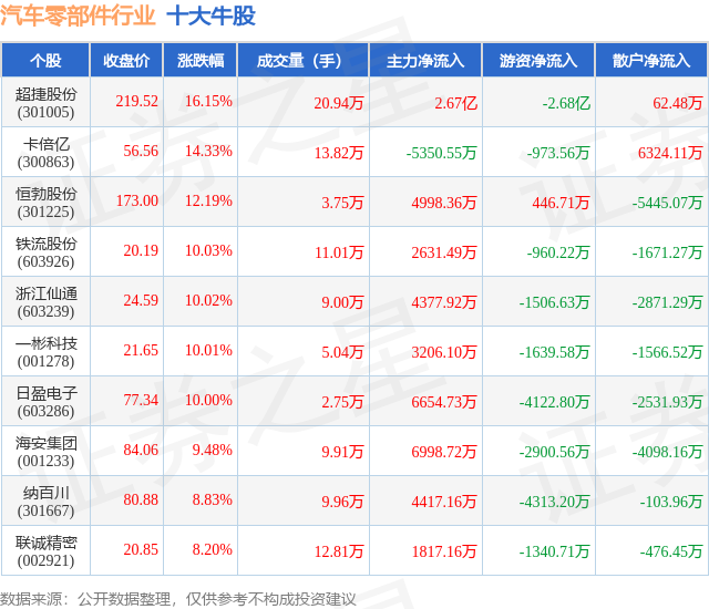 个股表现方面,汽车零部件行业当日领涨股为超捷股份(301005),该股当日报收219.52,上涨16.15%,成交量20.94万,主力资金净流入2.67亿元。卡倍亿(300863)以上涨14.33%紧随其后,该股当日成交量13.82万,主力资金净流出5350.55万元。除此之外,恒勃股份(301225)、铁流股份(603926)、浙江仙通(603239)均进入当日牛股之列。具体个股列表见下表:
