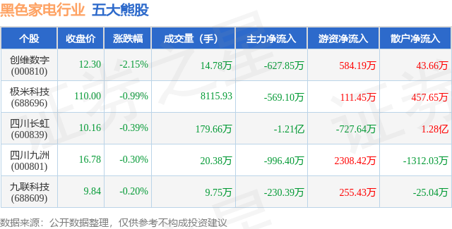 个股表现方面,黑色家电行业当日领跌股为创维数字(000810),该股当日报收12.3,下跌2.15%,成交量14.78万,主力资金净流出627.85万元。极米科技(688696)以下跌0.99%紧随其后,该股当日成交量8116.0,主力资金净流出569.1万元。除此之外,四川长虹(600839)、四川九洲(000801)、九联科技(688609)均进入当日熊股之列。具体个股列表见下表: