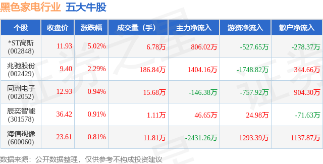 个股表现方面,黑色家电行业当日领涨股为*ST高斯(002848),该股当日报收11.93,上涨5.02%,成交量6.78万,主力资金净流入806.02万元。兆驰股份(002429)以上涨2.29%紧随其后,该股当日成交量186.84万,主力资金净流入1404.16万元。除此之外,同洲电子(002052)、辰奕智能(301578)、海信视像(600060)均进入当日牛股之列。具体个股列表见下表: