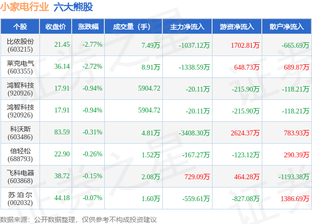 个股表现方面,小家电行业当日领跌股为比依股份(603215),该股当日报收21.45,下跌2.77%,成交量7.49万,主力资金净流出1037.12万元。莱克电气(603355)以下跌2.72%紧随其后,该股当日成交量8.91万,主力资金净流出1338.59万元。除此之外,鸿智科技(920926)、鸿智科技(920926)、科沃斯(603486)均进入当日熊股之列。具体个股列表见下表: