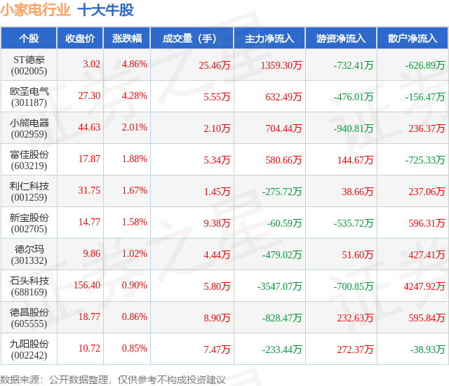 个股表现方面,小家电行业当日领涨股为ST德豪(002005),该股当日报收3.02,上涨4.86%,成交量25.46万,主力资金净流入1359.3万元。欧圣电气(301187)以上涨4.28%紧随其后,该股当日成交量5.55万,主力资金净流入632.49万元。除此之外,小熊电器(002959)、富佳股份(603219)、利仁科技(001259)均进入当日牛股之列。具体个股列表见下表: