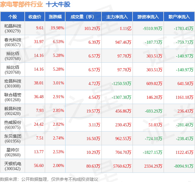 个股表现方面,家电零部件行业当日领涨股为和晶科技(300279),该股当日报收9.61,上涨19.98%,成交量103.29万,主力资金净流入1.11亿元。春光科技(603657)以上涨6.53%紧随其后,该股当日成交量6.39万,主力资金净流入947.46万元。除此之外,拾比佰(920768)、拾比佰(920768)、宏昌科技(301008)均进入当日牛股之列。具体个股列表见下表: