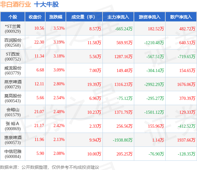 个股表现方面,非白酒行业当日领涨股为*ST兰黄(000929),该股当日报收10.56,上涨3.53%,成交量8.57万,主力资金净流出665.24万元。百润股份(002568)以上涨3.19%紧随其后,该股当日成交量11.58万,主力资金净流入569.95万元。除此之外,ST西发(000752)、威龙股份(603779)、燕京啤酒(000729)均进入当日牛股之列。具体个股列表见下表:
