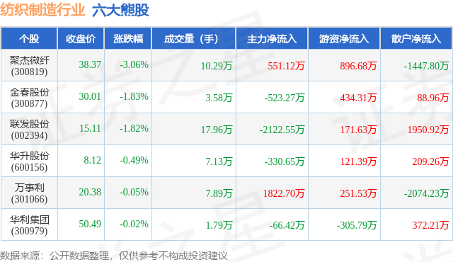 个股表现方面,纺织制造行业当日领跌股为聚杰微纤(300819),该股当日报收38.37,下跌3.06%,成交量10.29万,主力资金净流入551.12万元。金春股份(300877)以下跌1.83%紧随其后,该股当日成交量3.58万,主力资金净流出523.27万元。除此之外,联发股份(002394)、华升股份(600156)、万事利(301066)均进入当日熊股之列。具体个股列表见下表: