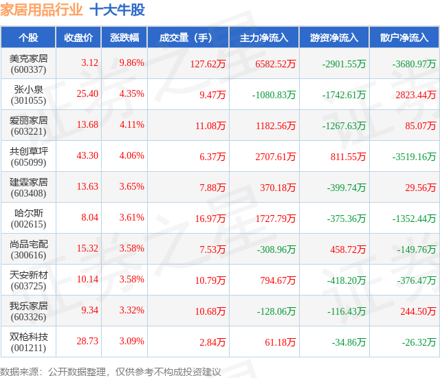 个股表现方面,家居用品行业当日领涨股为美克家居(600337),该股当日报收3.12,上涨9.86%,成交量127.62万,主力资金净流入6582.52万元。张小泉(301055)以上涨4.35%紧随其后,该股当日成交量9.47万,主力资金净流出1080.83万元。除此之外,爱丽家居(603221)、共创草坪(605099)、建霖家居(603408)均进入当日牛股之列。具体个股列表见下表: