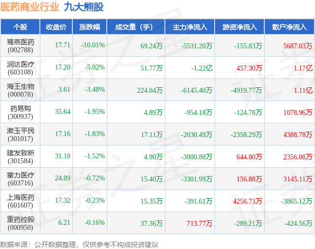 个股表现方面,医药商业行业当日领跌股为鹭燕医药(002788),该股当日报收17.71,下跌10.01%,成交量69.24万,主力资金净流出5531.2万元。润达医疗(603108)以下跌5.02%紧随其后,该股当日成交量51.77万,主力资金净流出1.22亿元。除此之外,海王生物(000078)、药易购(300937)、漱玉平民(301017)均进入当日熊股之列。具体个股列表见下表: