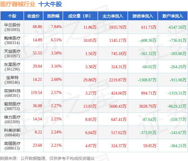 个股表现方面,医疗器械行业当日领涨股为华兰股份(301093),该股当日报收68.8,上涨7.84%,成交量11.86万,主力资金净流入5935.78万元。戴维医疗(300314)以上涨6.51%紧随其后,该股当日成交量10.05万,主力资金净流入1145.17万元。除此之外,天益医疗(301097)、东星医疗(301290)、宝莱特(300246)均进入当日牛股之列。具体个股列表见下表: