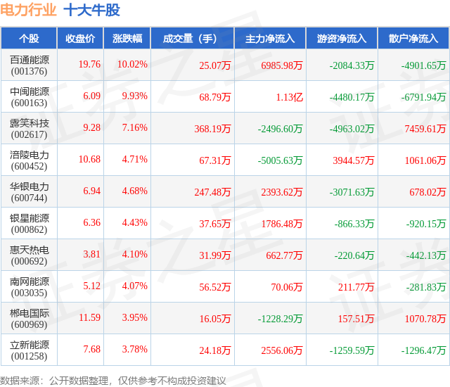 个股表现方面,电力行业当日领涨股为百通能源(001376),该股当日报收19.76,上涨10.02%,成交量25.07万,主力资金净流入6985.98万元。中闽能源(600163)以上涨9.93%紧随其后,该股当日成交量68.79万,主力资金净流入1.13亿元。除此之外,露笑科技(002617)、涪陵电力(600452)、华银电力(600744)均进入当日牛股之列。具体个股列表见下表: