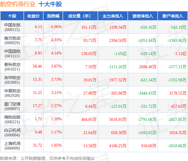 个股表现方面,航空机场行业当日领涨股为中国东航(600115),该股当日报收6.13,上涨6.06%,成交量161.15万,主力资金净流入1199.34万元。南方航空(600029)以上涨4.31%紧随其后,该股当日成交量93.73万,主力资金净流入2394.5万元。除此之外,中国国航(601111)、春秋航空(601021)、吉祥航空(603885)均进入当日牛股之列。具体个股列表见下表: